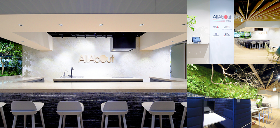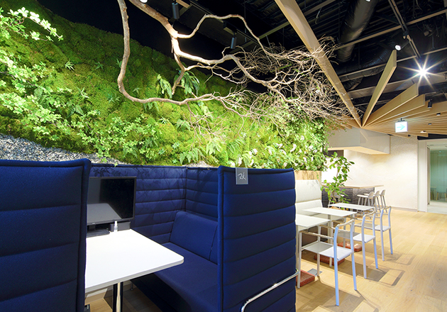 2021年6月に移転したオフィスは、緑を多く配置して癒やされる空間に。入り口を入ると大きなキッチンに目を奪われます。