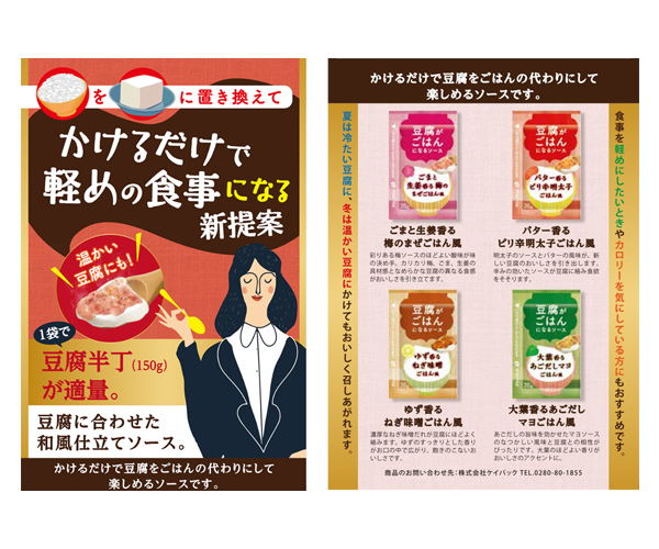 「豆腐がごはんになるソース」は、かけるだけで豆腐をごはんの代わりしてに楽しめるソース。ごはんを豆腐に置き換えて軽めの食事になる新提案でサンプル百貨店でも人気の商品。今回、サンプル百貨店会員からモニターを集めて開発・商品化された新フレーバーをご紹介しました。