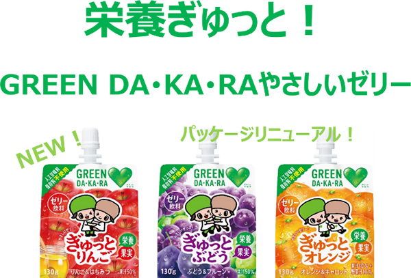 心とカラダにやさしい「GREEN DA・KA・RA」からやさしいゼリーをご紹介。果汁量が多くフレッシュな味わい、食物繊維・ビタミン群や、フレーバーごとに鉄分、β-カロテン、リンゴ酸といった栄養素が摂れ、人工甘味料・保存料不使用のカラダにやさしい中味設計。子供もうれしくてママとパパも助かります。