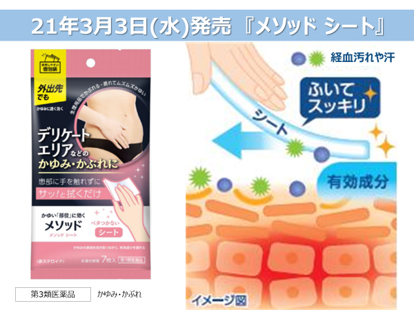 女性のデリケートエリアのトラブル1位は「かゆみ」。かゆい部位で選べるメソッドシリーズから3月3日発売の「メソッド シート」は日本初、シートタイプのかゆみ治療薬。手のひら大サイズの天然コットンシートだから、患部に直接触れずに、経血汚れや汗などを拭き取りながら、有効成分を塗ることができます。