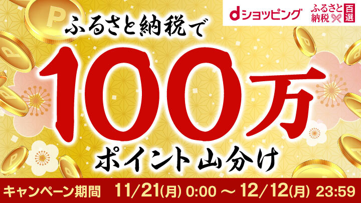 『dショッピング ふるさと納税百選』では、寄付額1億円突破を記念し、「dショッピング ふるさと納税でdポイント100万ポイント山分けキャンペーン」を、2022年11月21日より開催いたします。