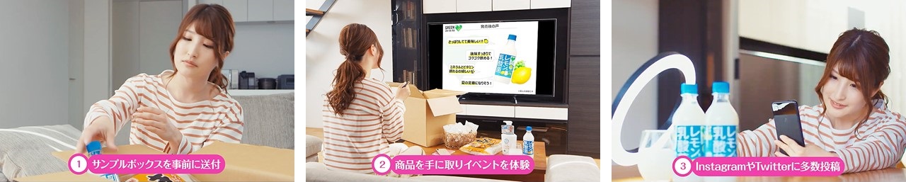 サンプリング商品の詰め合わせが自宅に届き、プレゼン動画を視聴します。配信当日限定で参加者専用チャットを開設しイベントを盛り上げます。居住地を限定されず、外出が困難な方もご参加いただけるため毎回多数のご応募をいただいています。